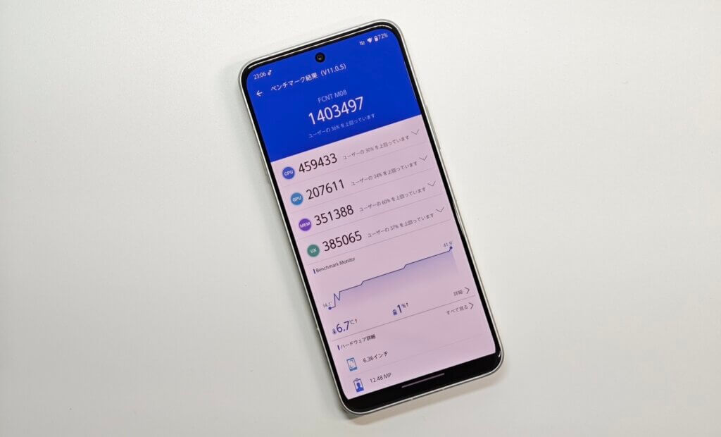arrows Alphaは、SoCにMediaTekのDimensity 8350 Extremeを採用し、Antutuでは約140万点というスコアを記録する。これは、数年前のフラッグシップモデルと肩を並べる水準だ。