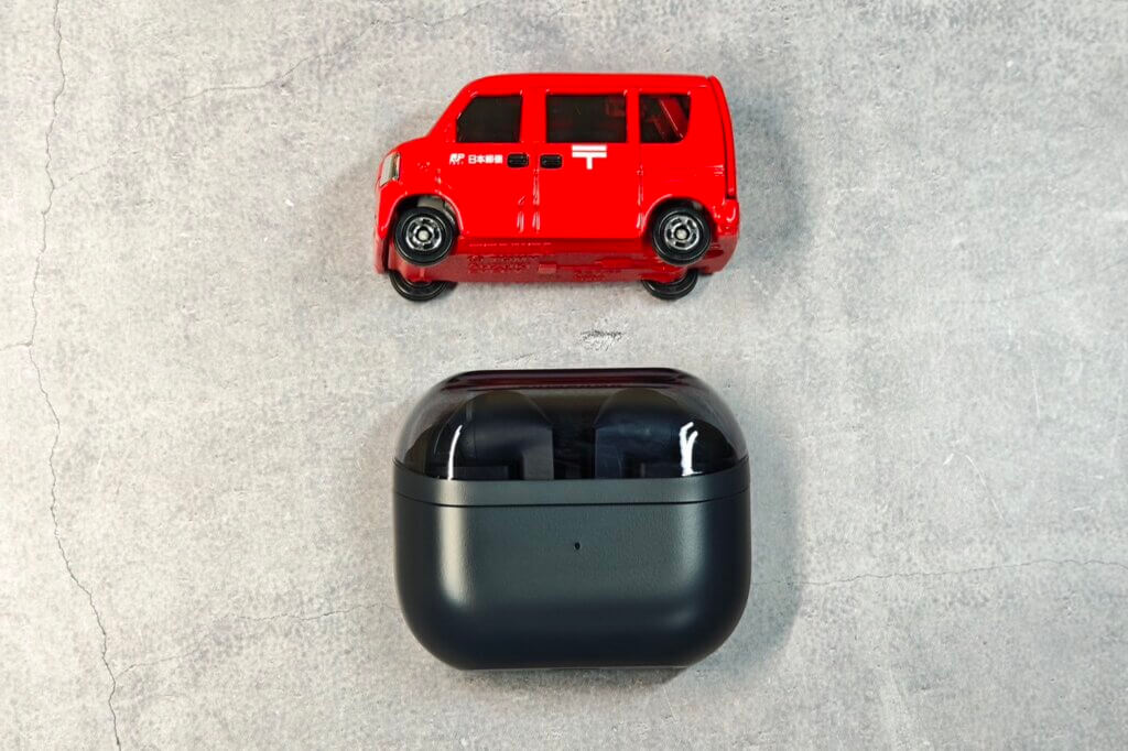 本体サイズを手元にあったトミカ郵便車と比較。ちなみに、重量はかなり軽量化されており、驚くほど軽い5g。