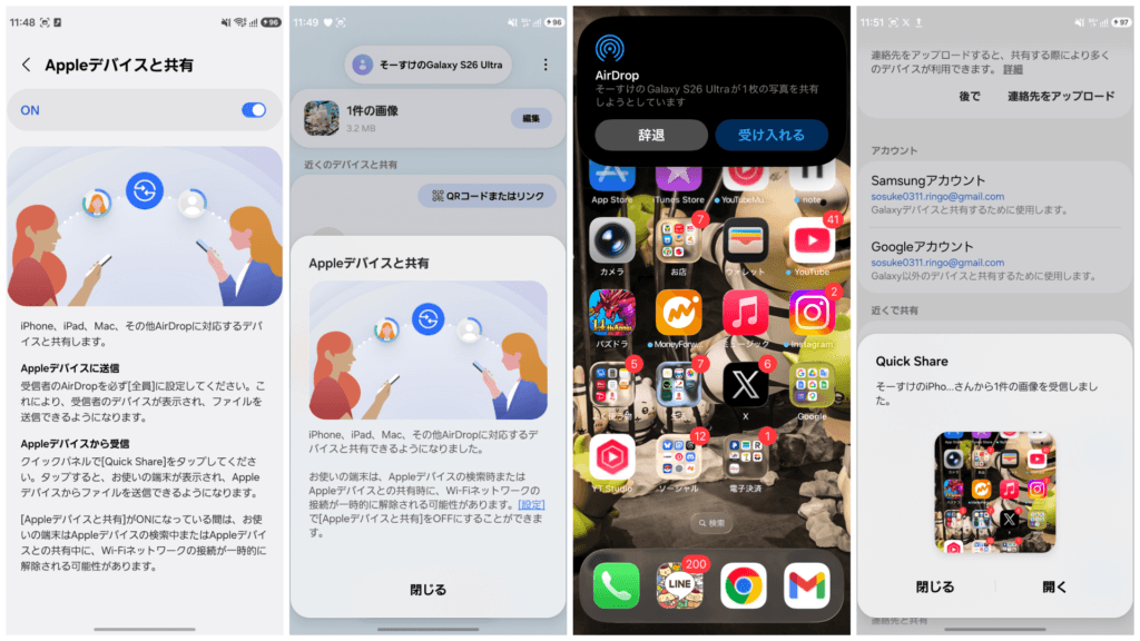 noteでも触れましたが、先日行われたOneUI 8.5のアップデート後からAppleデバイスとのデータ共有が可能になりました。