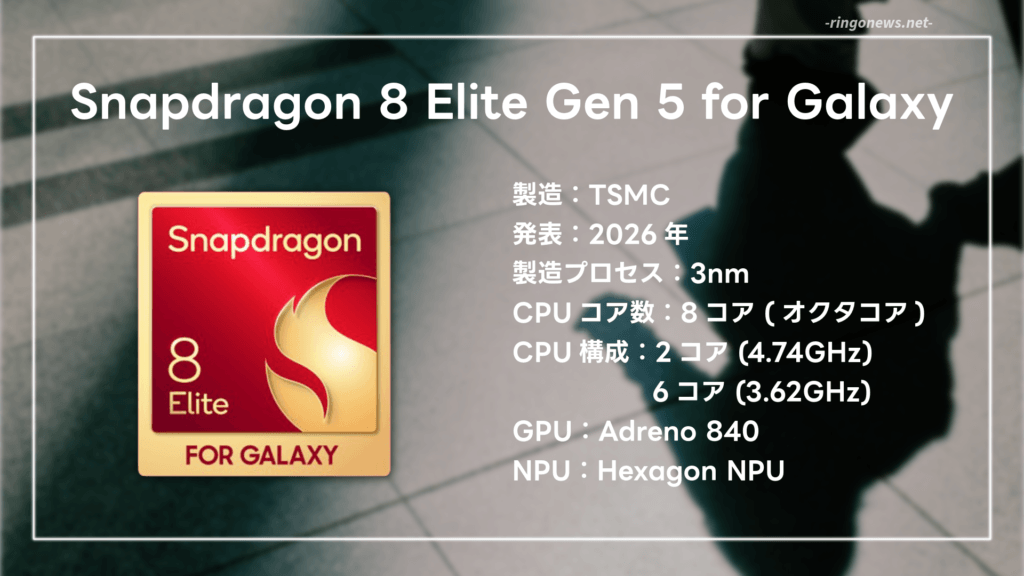 Galaxy向けに最適化されたハイエンドSoC『Snapdragon® 8 Elite Gen 5 for Galaxy』を採用。毎度思うんですけど、どっかのモバイルバッテリー並に長い名前のSoCですね。