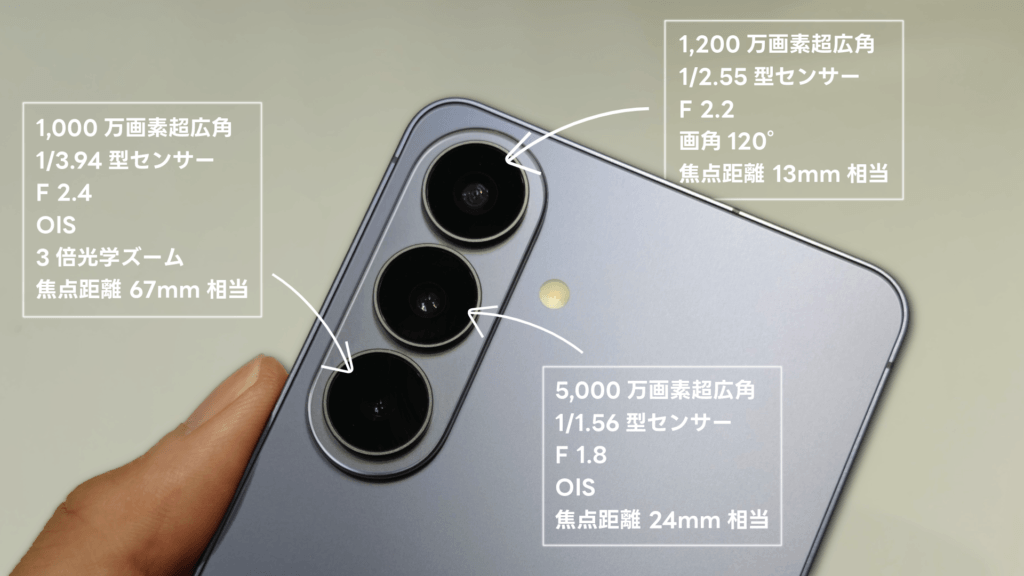 カメラは3眼構成で、S26無印とは共通。S22からここまでハード面として大きな進化はありません。