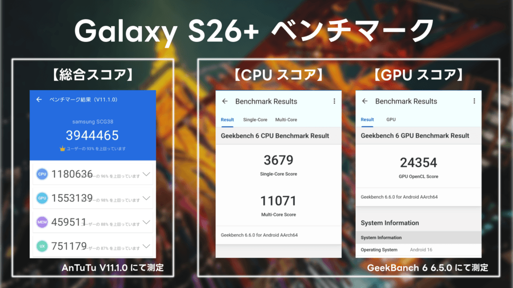 また、充電に関しては『超急速充電3.0』に対応したGalaxy S26 Ultraとは異なり、Galaxy S26+は有線で最大45W、ワイヤレス充電で最大20Wと前モデルから据え置き。