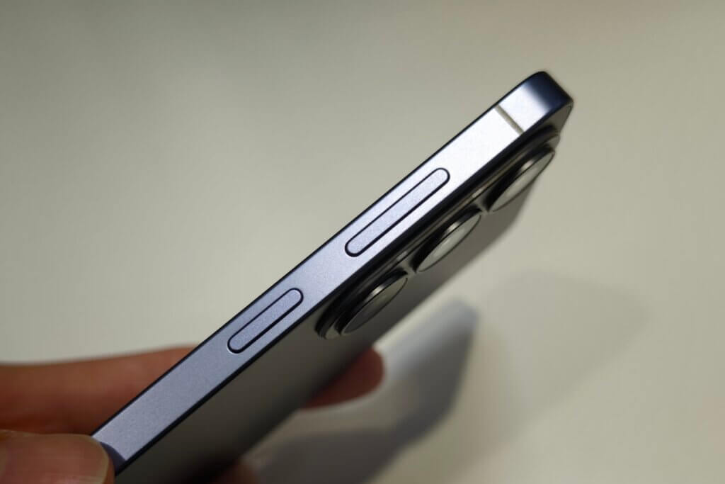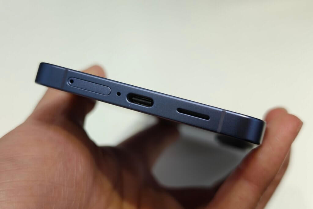 ディスプレイを正面として『本体右側面』に音量キー / 電源キーを備え『本体下部』にはSIMトレイ / USB-Cポート / スピーカーを備えます。