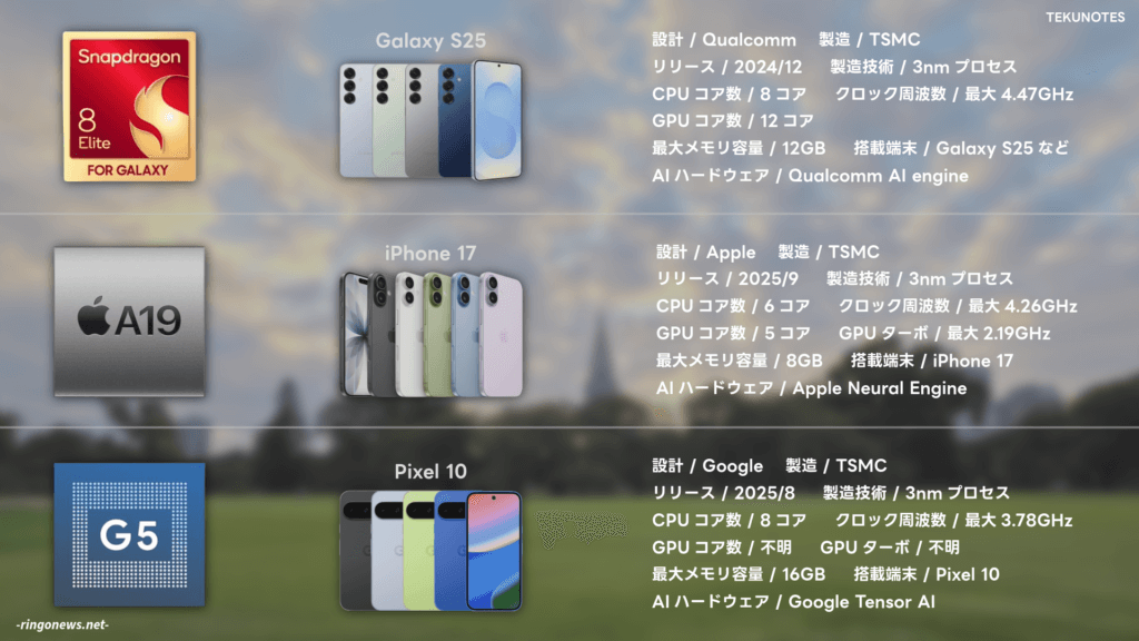 『メモリ』についてはGoogle S25 / Pixel 10が12GB、iPhone 17が8GBと数値上ではAndroid側に軍配が上がります。