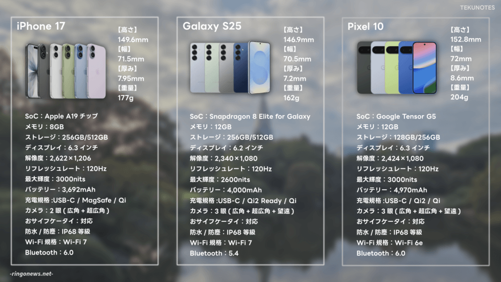 同世代、同価格帯のライバル機『Google Pixel 10』とも合わせて比較していきます。