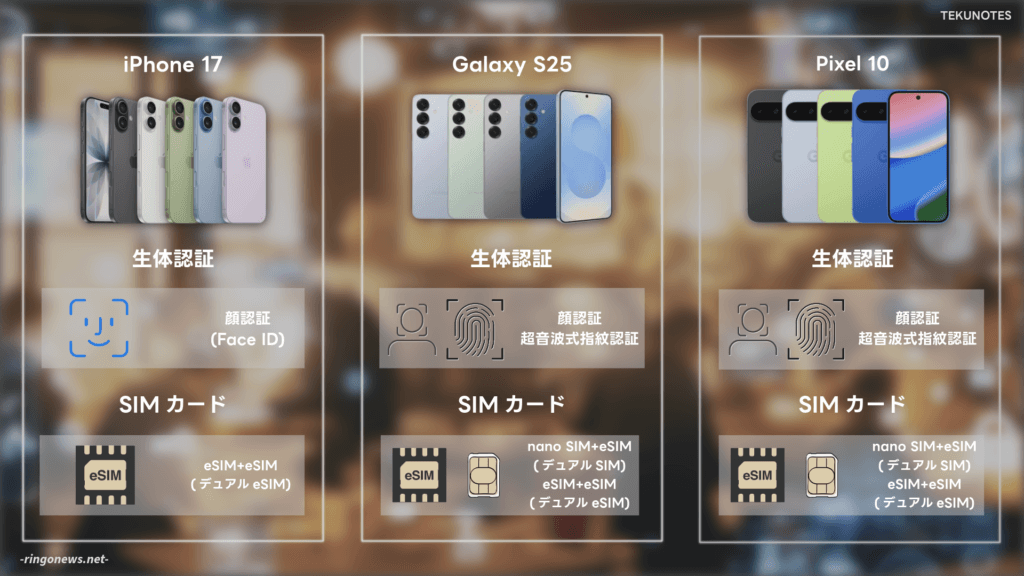 『生体認証』についてはiPhone 17が顔認証 (Face ID)に対応。Galaxy S25 / Pixel 10が顔認証画面内指紋認証に対応。いずれも超音波式を採用してる事もあり、認証速度や正確さがiPhoneにはない強みとなります。