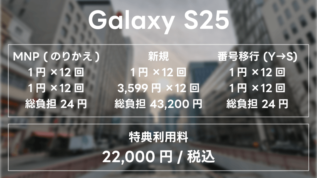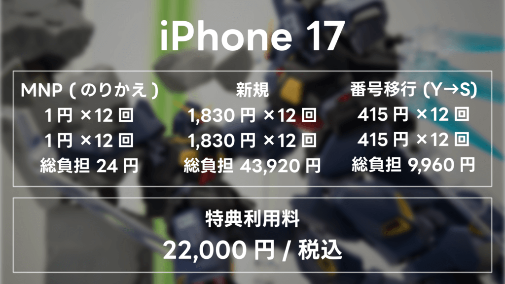 こちらは他社からのMNP/ワイモバイルからの番号移行時であれば2年間の総負担額が24円。特典利用料 22,000円を加味しても22,024円とiPhone 17と同様です。