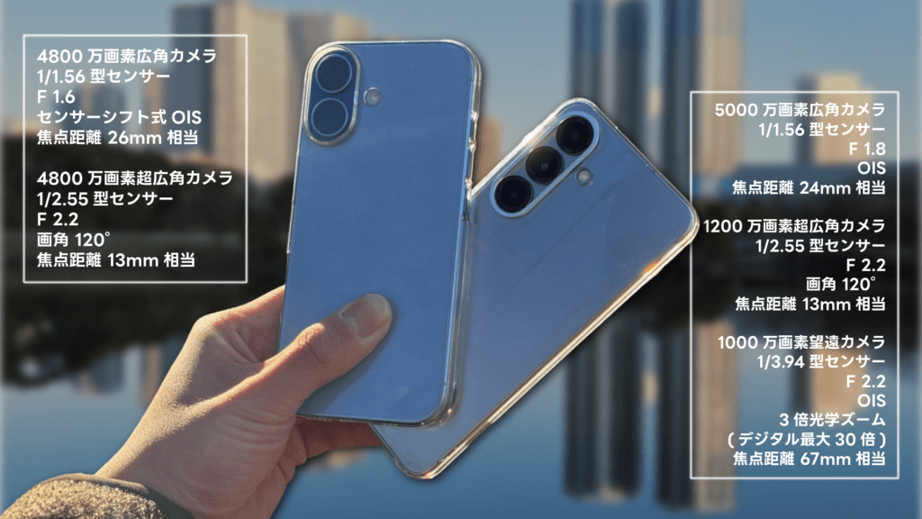 iPhone 17については広角カメラと超広角カメラの2眼構成。望遠カメラは非搭載です。一方、Galaxy S25については広角カメラと超広角カメラ、そして望遠カメラの3眼構成です。