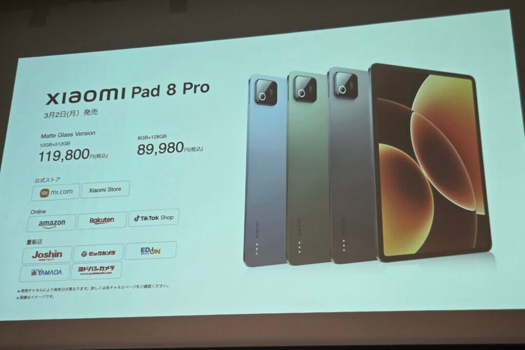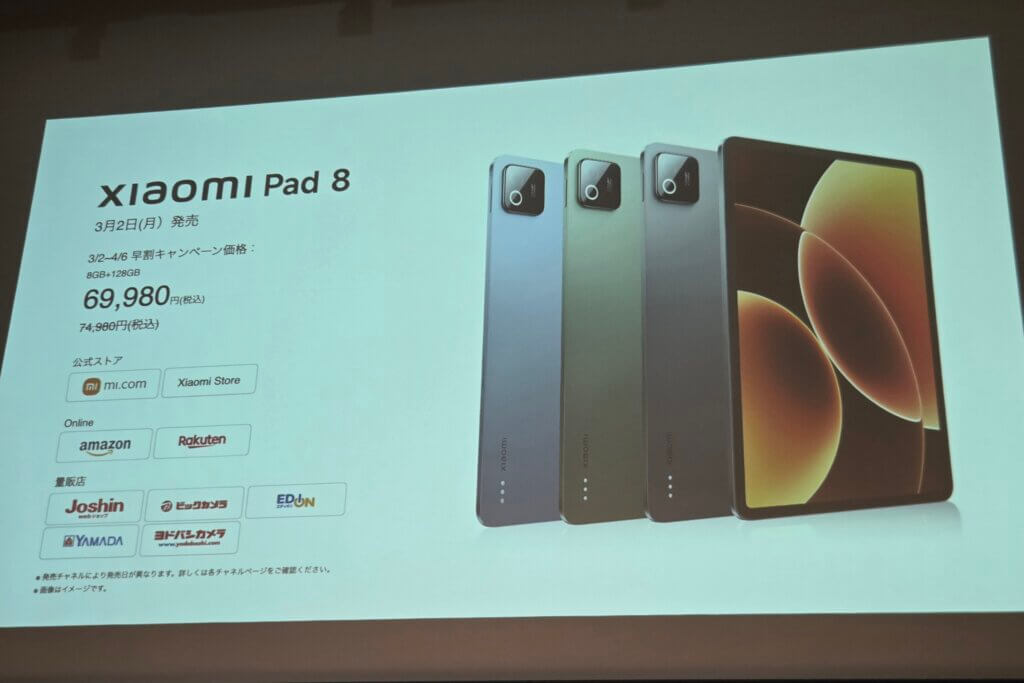 最後に価格や販路についてですが、Xiaomi Pad 8については8GB+128GBモデルのみで税込69,980円。