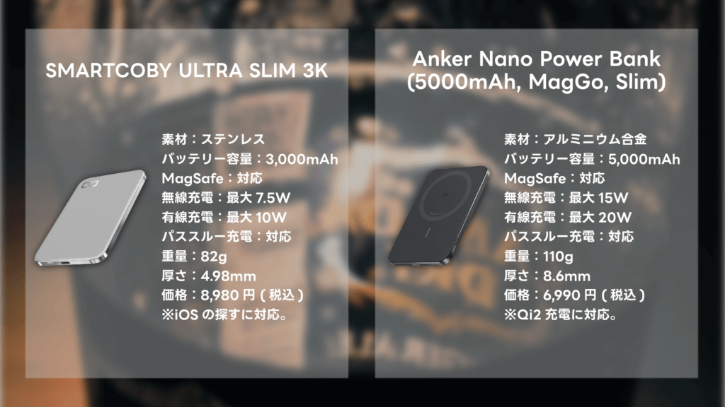 まずは気になる価格ですが『CIO SMARTCOBY ULTRA SLIM 3K』が8,980円、『Anker Nano Power Bank (5000mAh, MagGo, Slim)』が6,990円と価格面ではAnkerに軍配が上がります。