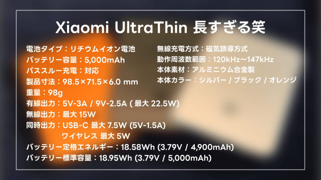 そんなXiaomiが投入してきたのが、MagSafe対応モデルとしては3つ目となる『Xiaomi UltraThin Magnetic Power Bank 5000 15W』というわけです。まじで名前長すぎなんよな笑